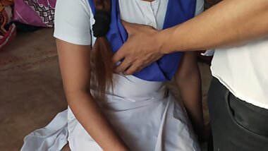 "Virgin-pussy schoolgirl does homework alone at home and stepdad arrives"
