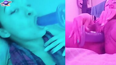 "Saturn Squirt, cyan and pink with hairy pussy masturbation, with pussy cream."