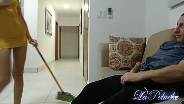 "18 years old CFNM, Old man self hand job watching young and sexy cleaning lady"