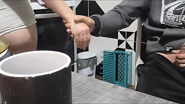 "stepfather gives a risky handjob when he sees his stepdaughter wash the dishes"